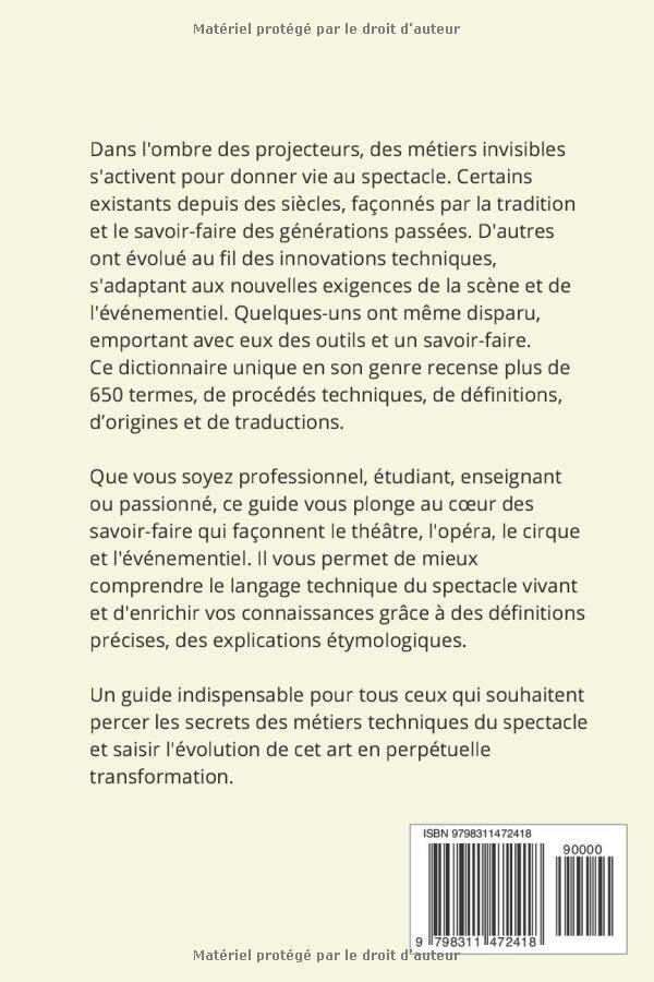 Théâtre, opéra, cirque, événementiel… cet ouvrage recense : techniques, procédés et définitions, des méthodes ancestrales aux innovations récentes, avec des précisions étymologiques et des explications claires.Que vous soyez professionnel, étudiant ou passionné, c’est un outil indispensable pour décrypter les coulisses et comprendre l’évolution des métiers qui font briller la scène : éclairage, accessoires, machinerie, tapisserie, costume…